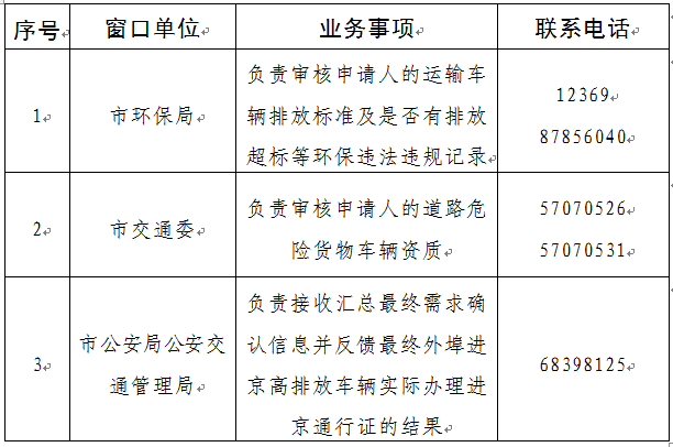 (三)联合窗口对申请内容进行确认。市环保局对承运车辆的排放标准及是否有排放超标等环保违法违规记录进行审核。核准同意的,通过平台将结果告知市公安局公安交通管理局,并提示申请人办理进京通行证的相关规定和所需材料。核准不同意的,注明理由后通过平台通知行业窗口相应部门。